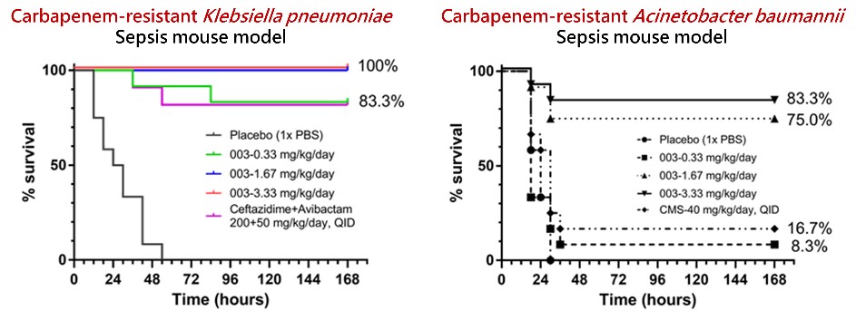 Compared to those on the market (avibactam-ceftazidime, imipenem-relebactam, and others), AS101-003 is a first-in-class antibiotic which could be expected that bacteria would develop resistance slower. The one-step synthesis of AS101-003 economizes the production fee. Organic tellurium compound AS101-003 revealed remarkable activities against Gram-Negative bacterium, including Enterobacterales, Acinetobacter spp., Elizabethkingia spp., and Neisseria gonorrhoeae. The median lethal dose for mice was approximately 23.3 mg/kg. The sepsis mouse models infected by carbapenem-resistant Klebsiella pneumoniae or carbapenem-resistant Acinetobacter baumannii could be rescued using doses of 1.67 and 3.33 mg/kg/day, with survival rates of over 80%.