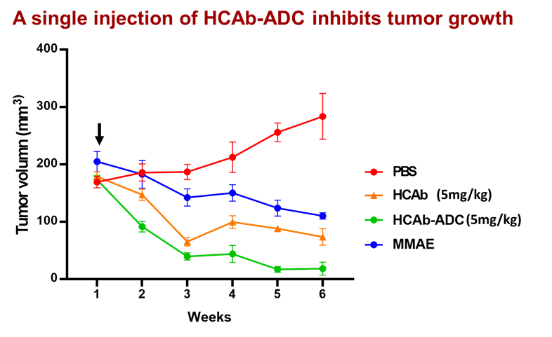 Carcinoembryonic Antigen-Related Cell Adhesion Molecule 6 (CEACAM6) is a phosphatidyl inositol (GPI)-anchored glycoprotein specifically expressed on the surface of cancer cells. We generated a anti-CEACAM6 heavy chain antibody (TMU HCAb) from a camelid immunized library to recognize glycosylated CEACAM6 which possesses characteristics such as small molecular weight, high specificity, high affinity, stability, and strong tissue penetration. We developed TMU HCAb-ADC (Antibody-Drug Conjugate) which can effectively eradicate CRC cells in xenograft models. In addition, HCAb-ADC selectively kills CEACAM6- expressing tumor cells with minimal toxicity to peripheral blood mononuclear cells (PBMC), highlighting its potential as an ADC candidate.