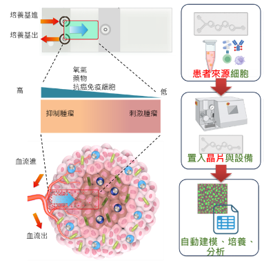 After obtaining tumor samples from patients post-surgery, they are dissociated, stained with apoptosis indicators, and transplanted into tumor microenvironment chips. An automated pumping and analysis system is then employed to assess the efficacy of drugs predicted by physicians.
