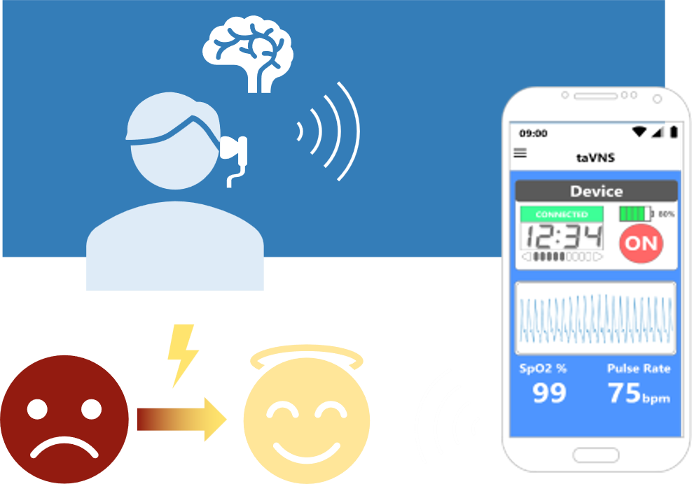The product development of this project integrates the taVNS control interface and in-ear optical measurement information into a single information platform, inspired by existing neckband-style headphones on the market. It will design taVNS electrode fixation mechanisms and in-ear optical measurement mechanisms that conform to the human ear shape, and conceal power sources and stimulation and measurement circuits within an integrated neckband mechanism. Integrated with wireless transmission technologies such as Bluetooth or WIFI into smart mobile devices, users can control the device through a single interface and obtain real-time optical measurement information.